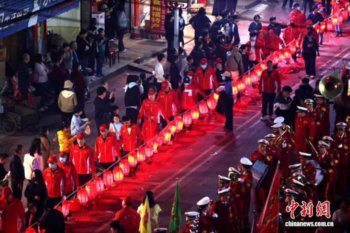 2月25日(农历大年初九)晚,福建南安英都镇举办拔拔灯民俗活动,一盏盏红灯笼串成“灯龙”沿镇区巡游祈福。黄奕群 摄