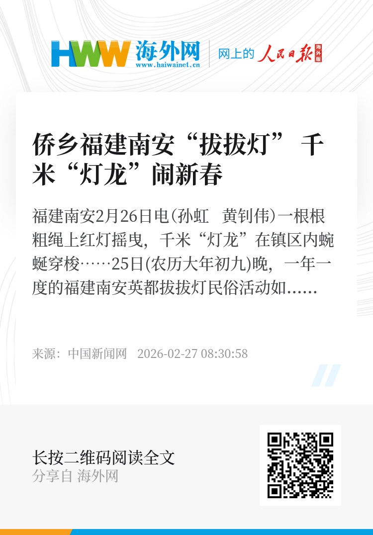 中新网福建南安2月26日电(孙虹 黄钊伟)一根根粗绳上红灯摇曳,千米“灯龙”在镇区内蜿蜒穿梭……25日(农历大年初九)晚,一年一度的福建南安英都拔拔灯民俗活动如约而至,26个灯阵、近万名民众同心聚力,将一盏盏红灯笼串成“灯龙”,沿镇区巡游祈福,再现传承数百年的民俗盛景。
