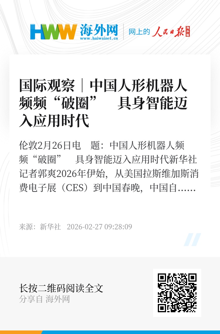 2026年伊始,从美国拉斯维加斯消费电子展(CES)到中国春晚,中国自主研发的人形机器人频频“破圈”,多家中国企业的产品和应用不仅在海外业界引发热议,更是在全球社交媒体平台和国际媒体不断“刷屏”。