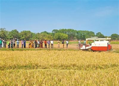 在冈比亚中河区,中国援冈比亚农业技术合作项目组面向当地农户开展水稻联合收割机技术示范教学活动。