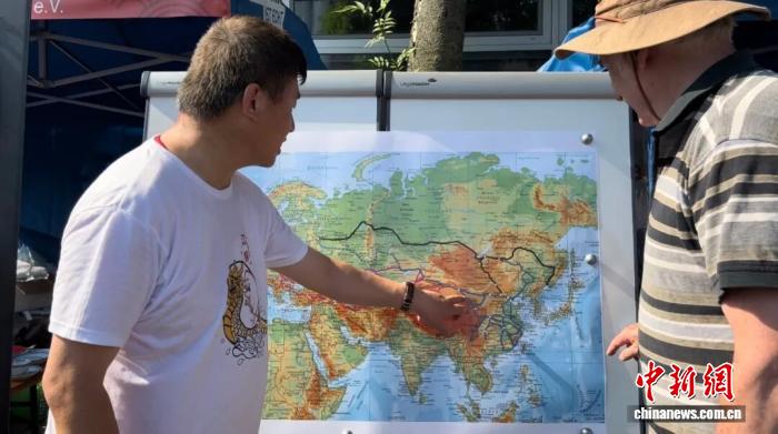 2023年6月11日,德国民众沃尔夫冈·卡利施克在德国杜伊斯堡趣味龙舟赛上了解中欧班列线路图。中新社记者 马秀秀 摄