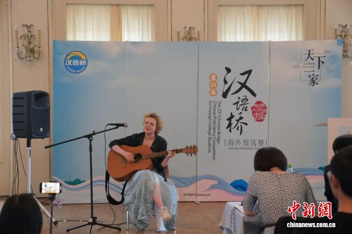 2024年5月25日,第二十三届“汉语桥”世界大学生中文比赛德国区决赛在莱比锡举行。图为特等奖得主李欢欣(Ann-Christin Otte)在比赛中展示才艺。中新社记者 马秀秀 摄