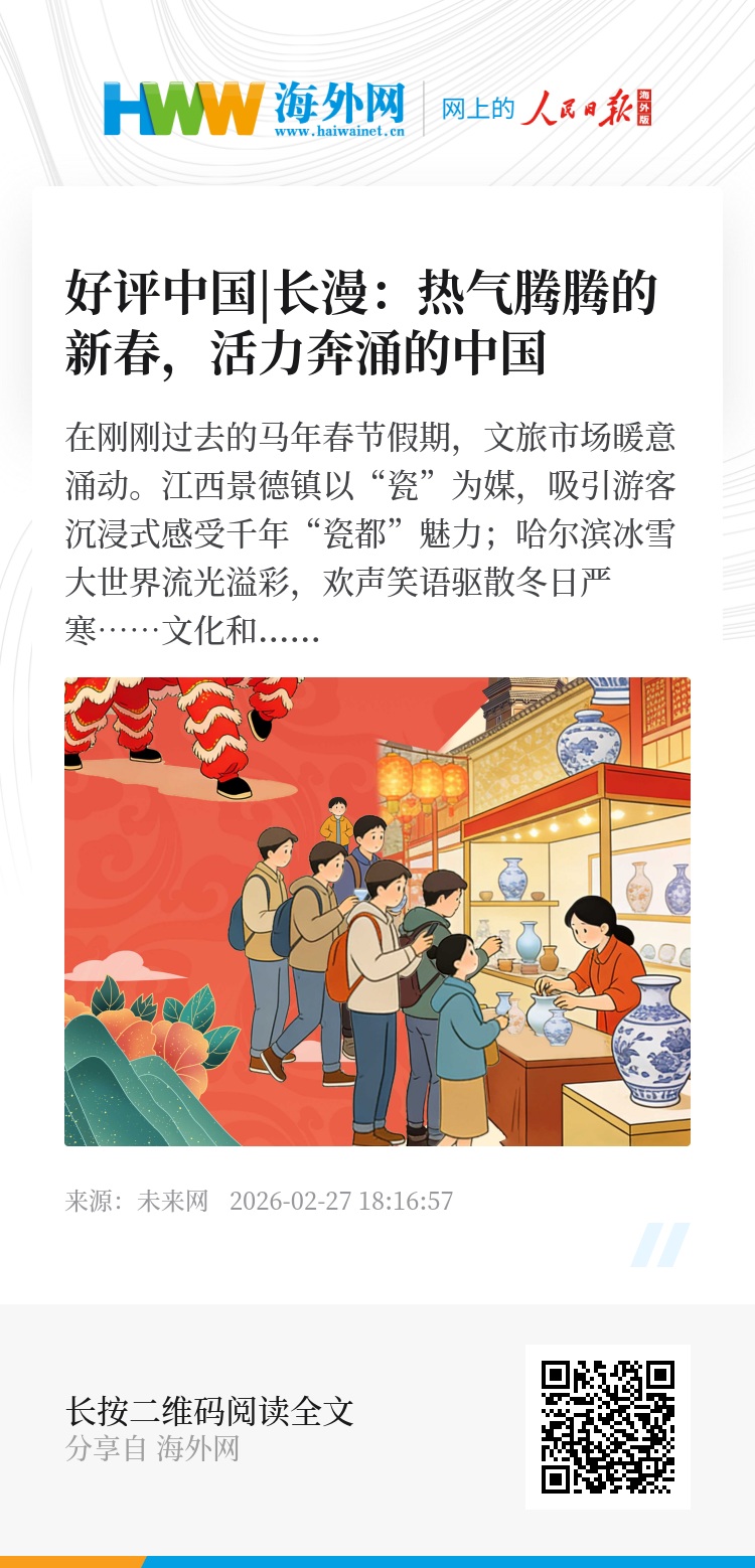 南来北往,策“马”而行。丙午马年春节假期文旅市场的“开门红”,见证着万家灯火里蕴藏的幸福,更为中国经济向新向上写下鲜活注脚。春潮涌动,万象更新,活力迸发、朝气蓬勃的中国必将继续策马扬鞭,奔赴下一场山海、书写下一段华章。(文字:魏平、徐文文;AI漫画:徐文文)