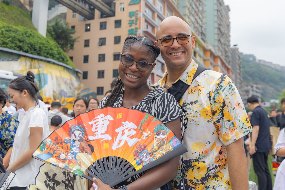 2025年10月3日,加拿大游客克里斯提安(左)和家人在重庆市渝中区李子坝游玩。近年来,不断优化的入境政策为境外游客赴华提供了更多便利,“来华旅游攻略”“赴华购物清单”等成为国外社交媒体热门搜索关键词,“China Travel”的热度延续至今。山城重庆凭借其独特的城市景观和风土人情,吸引不少外国游客前来品尝美食、打卡景点、体验文化。