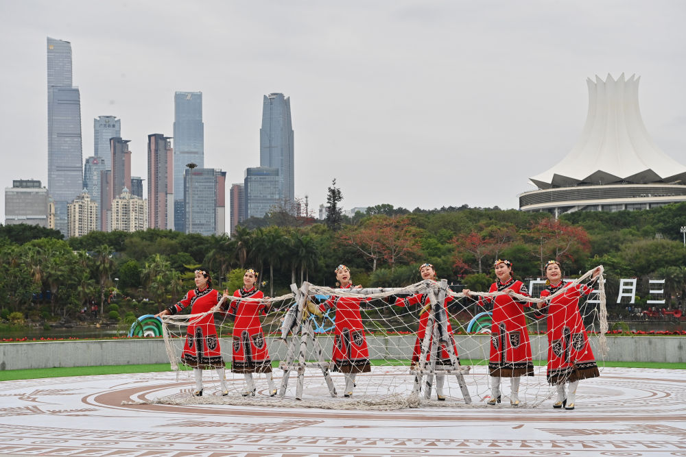 2026年2月19日,英歌舞队在广东省佛山市高明区滨荷Park生态文创园街头巡游表演。