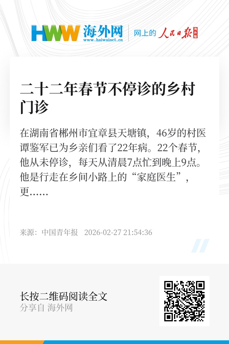 如今,在村卫生室里,谭鉴军学临床医学的儿子谭之焕已开始帮忙。他表示,明年大学毕业后,将接过父亲的接力棒,让“老谭家”的乡村医路继续走下去。(中青报·中青网记者 洪克非)