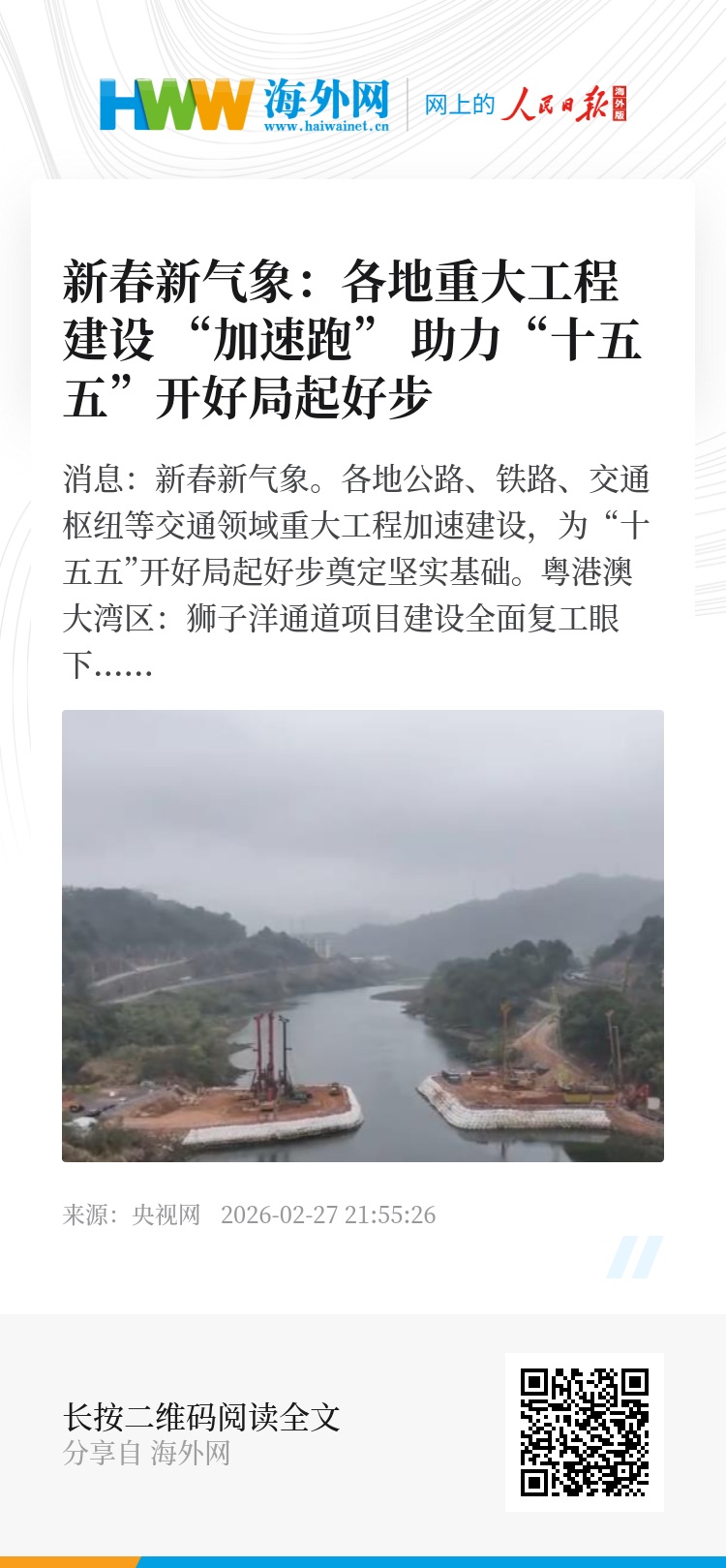 央视网消息:新春新气象。各地公路、铁路、交通枢纽等交通领域重大工程加速建设,为“十五五”开好局起好步奠定坚实基础。