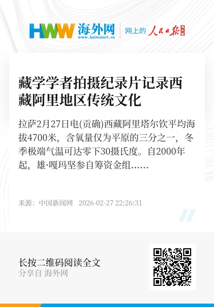 中新网拉萨2月27日电(贡确)西藏阿里塔尔钦平均海拔4700米,含氧量仅为平原的三分之一,冬季极端气温可达零下30摄氏度。自2000年起,雄·嘎玛坚参自筹资金组织了多只拍摄团队在此坚守二十余年,开展古象雄文明与当地民俗的抢救性记录工作,领队为土生土长的藏文化传承人、年过五旬的制片人雄·嘎玛坚参。