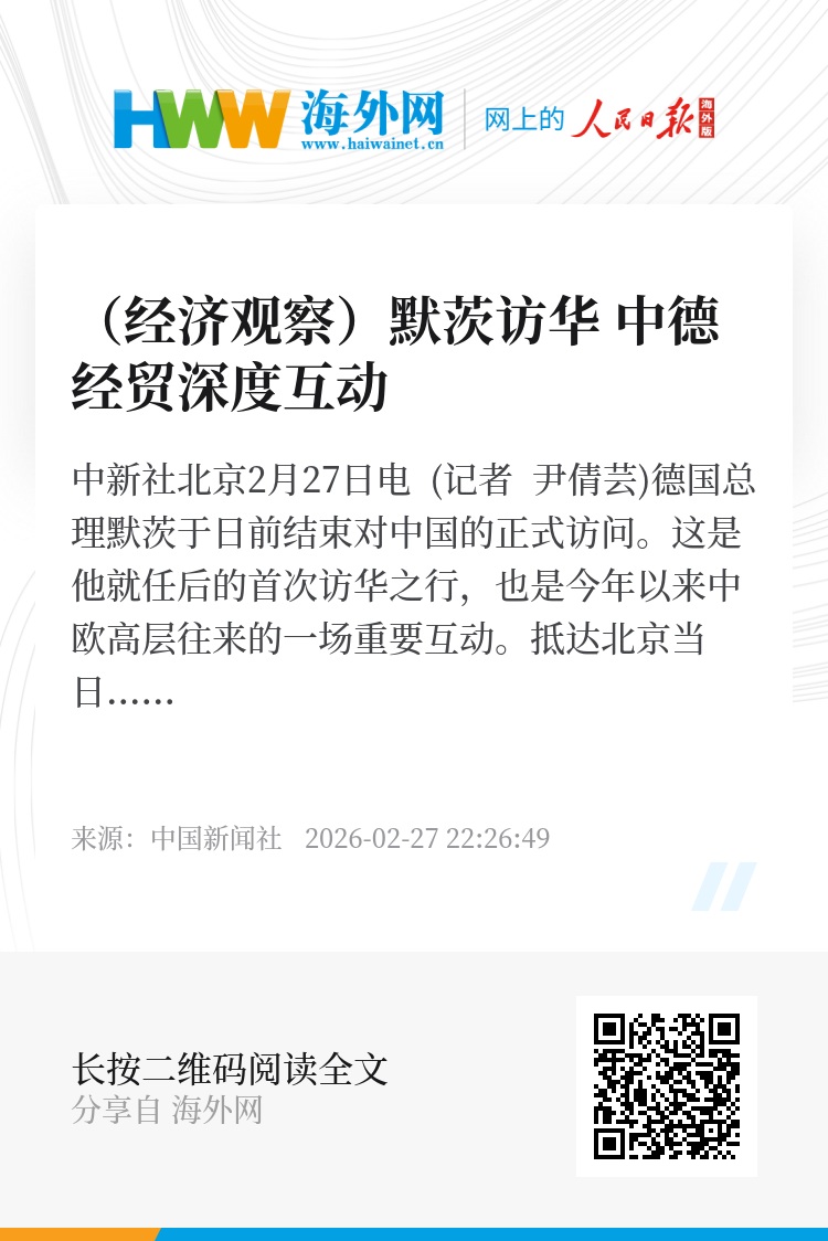 中新社北京2月27日电 (记者 尹倩芸)德国总理默茨于日前结束对中国的正式访问。这是他就任后的首次访华之行,也是今年以来中欧高层往来的一场重要互动。
