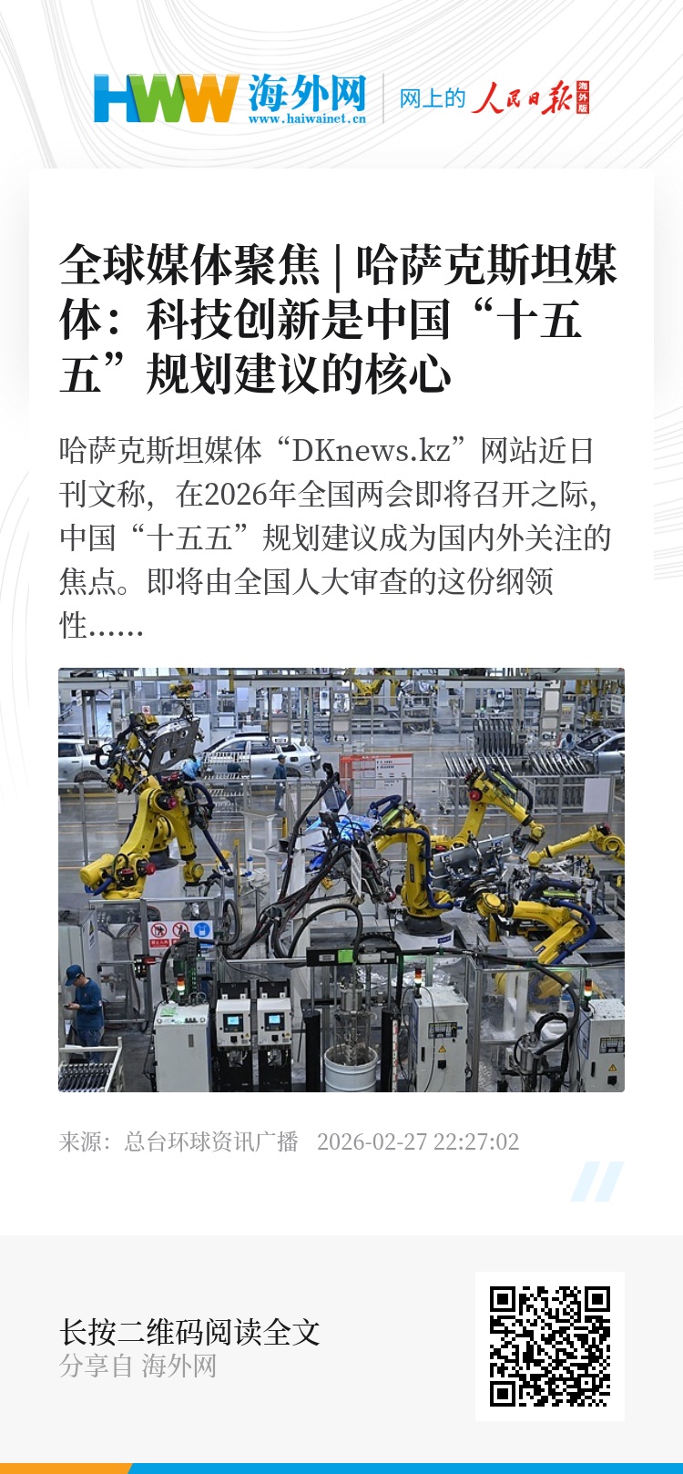 哈萨克斯坦媒体“DKnews.kz”网站近日刊文称,在2026年全国两会即将召开之际,中国“十五五”规划建议成为国内外关注的焦点。即将由全国人大审查的这份纲领性文件,将擘画未来五年全球第二大经济体的发展蓝图。从产业战略布局到经济发展优先项,解读这份具有里程碑意义的文件至关重要,因为其中的每一个字都对中国乃至世界有着深远的影响。