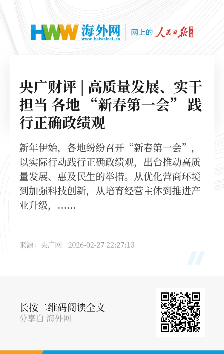 春启新程,实干为要。各地“新春第一会”释放出发展新信号,既是对新发展理念的深入践行,更是对正确政绩观的生动诠释。从重大项目攻坚到民生细节改善,从短期成效突破到长效机制构建,各地以“功成不必在我”的境界和“功成必定有我”的担当,不搞花架子,力戒形式主义,用心书写经得起实践、人民和历史检验的实绩。(央广网评论员 冀文超)