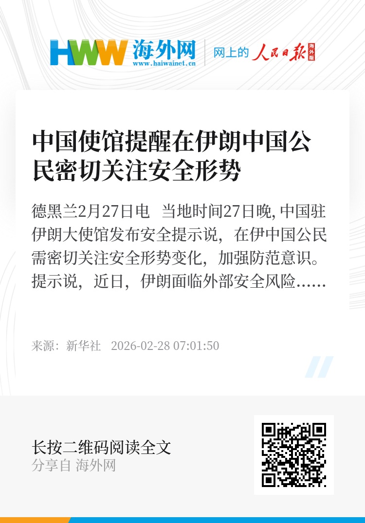 新华社德黑兰2月27日电 当地时间27日晚,中国驻伊朗大使馆发布安全提示说,在伊中国公民需密切关注安全形势变化,加强防范意识。
