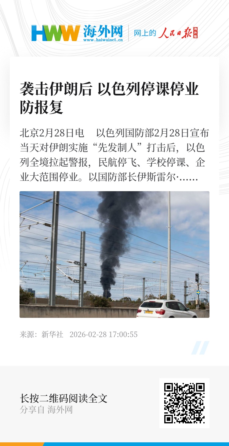 新华社北京2月28日电 以色列国防部2月28日宣布当天对伊朗实施“先发制人”打击后,以色列全境拉起警报,民航停飞、学校停课、企业大范围停业。