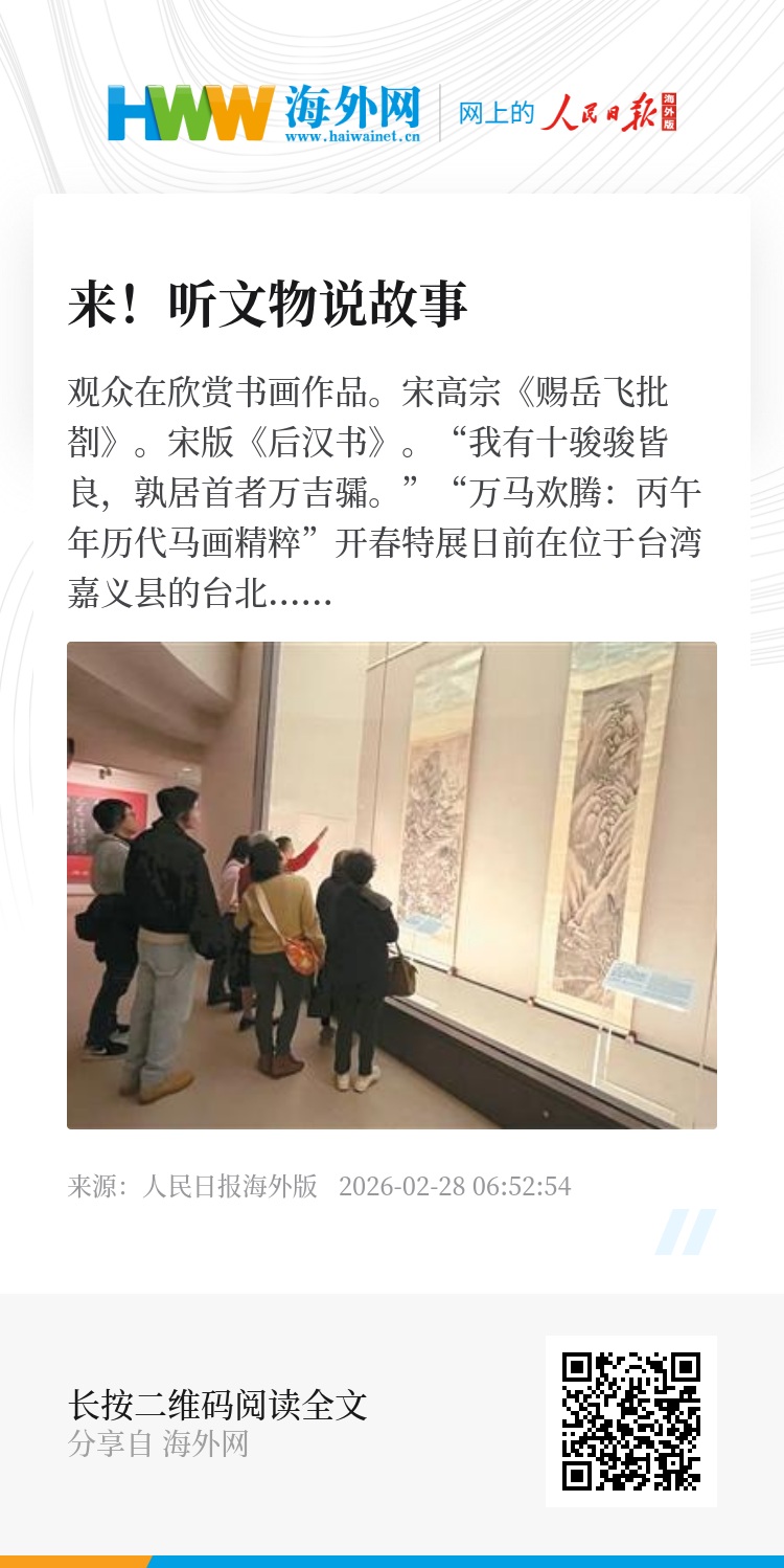 “我有十骏骏皆良,孰居首者万吉骦。”“万马欢腾:丙午年历代马画精粹”开春特展日前在位于台湾嘉义县的台北故宫博物院南院登场。展览分为“百骏生态”“历代马画”两大单元,吸引岛内外观众纷纷前来欣赏,体会不同朝代画家演绎马动静和神韵,在农历马年接受“马到成功”的美好祝福。