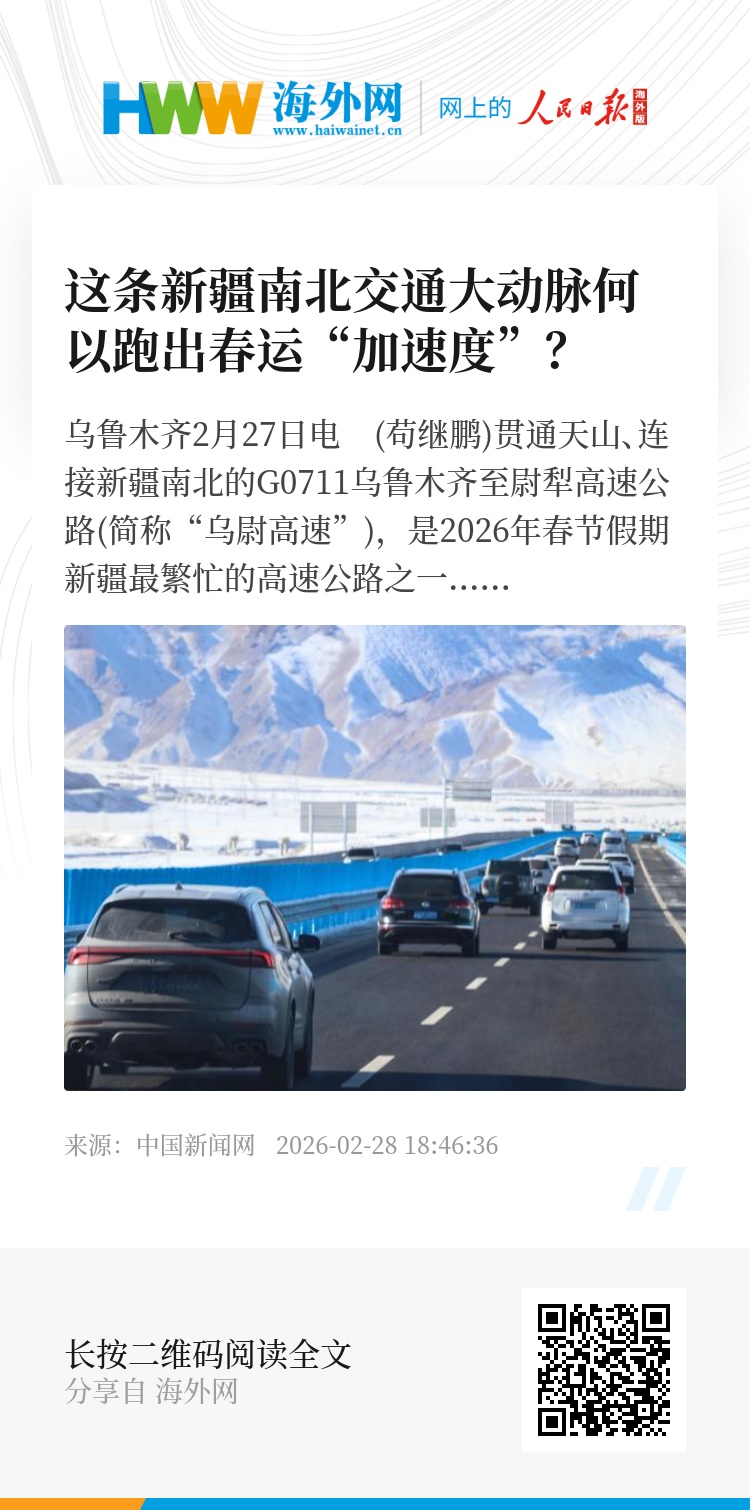 中新网乌鲁木齐2月27日电 (苟继鹏)贯通天山、连接新疆南北的G0711乌鲁木齐至尉犁高速公路(简称“乌尉高速”),是2026年春节假期新疆最繁忙的高速公路之一,9天累计通行车辆66.3万辆次,日均通行7.36万辆次。