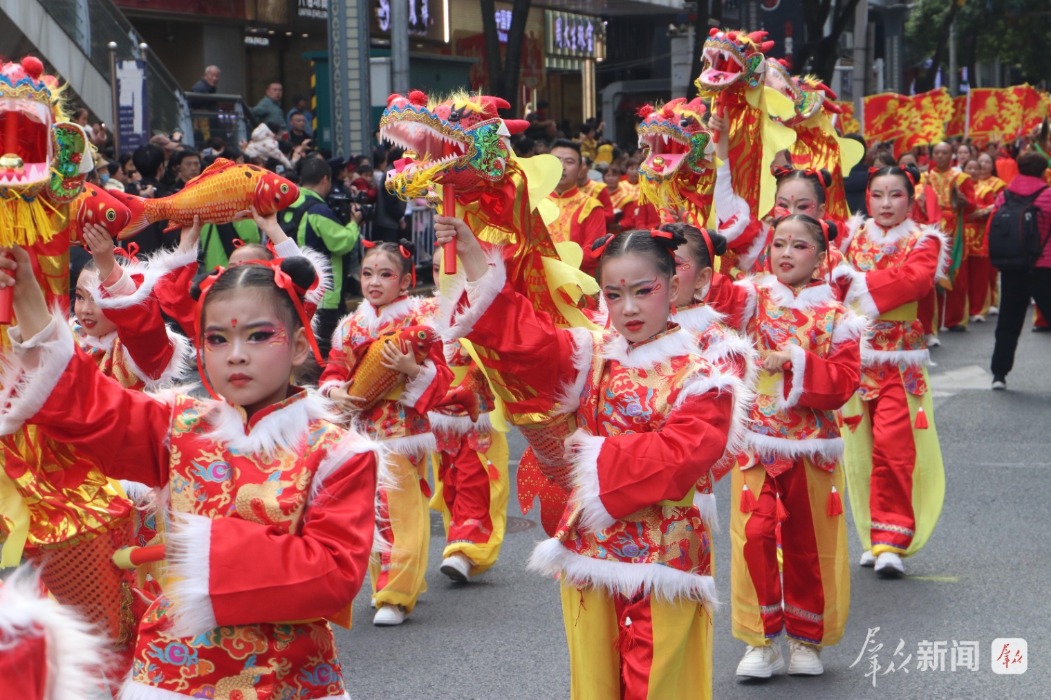 巡游沿途,观众呼朋引伴、摩肩接踵,欢呼声、喝彩声此起彼伏。大家纷纷拿出手机、相机记录精彩瞬间,大人小孩脸上都洋溢着新春的喜悦,不少市民跟着队伍一路前行,沉浸式体验社火巡游的热闹。