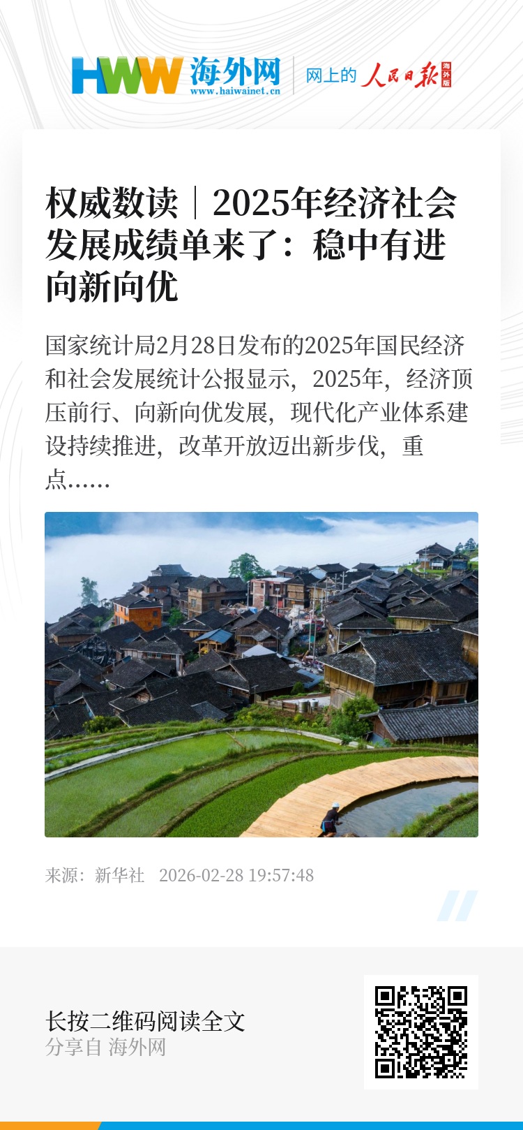国家统计局2月28日发布的2025年国民经济和社会发展统计公报显示,2025年,经济顶压前行、向新向优发展,现代化产业体系建设持续推进,改革开放迈出新步伐,重点领域风险化解取得积极进展,民生保障更加有力,社会大局保持稳定,第二个百年奋斗目标新征程实现良好开局。