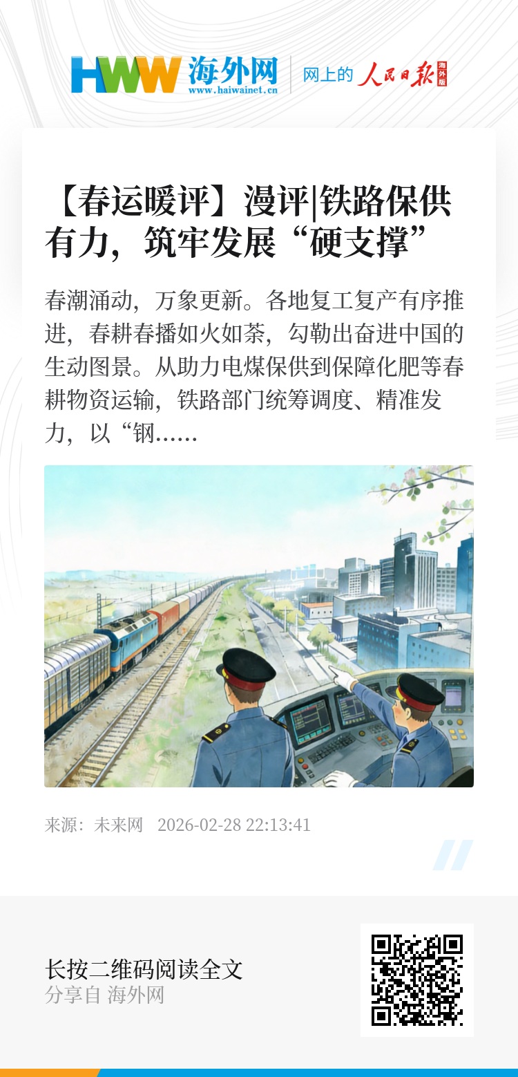 春潮涌动,万象更新。各地复工复产有序推进,春耕春播如火如荼,勾勒出奋进中国的生动图景。从助力电煤保供到保障化肥等春耕物资运输,铁路部门统筹调度、精准发力,以“钢铁大动脉”的高效运转筑牢物资运输安全防线,彰显守护民生的责任与担当,为经济社会高质量发展注入强劲动能。