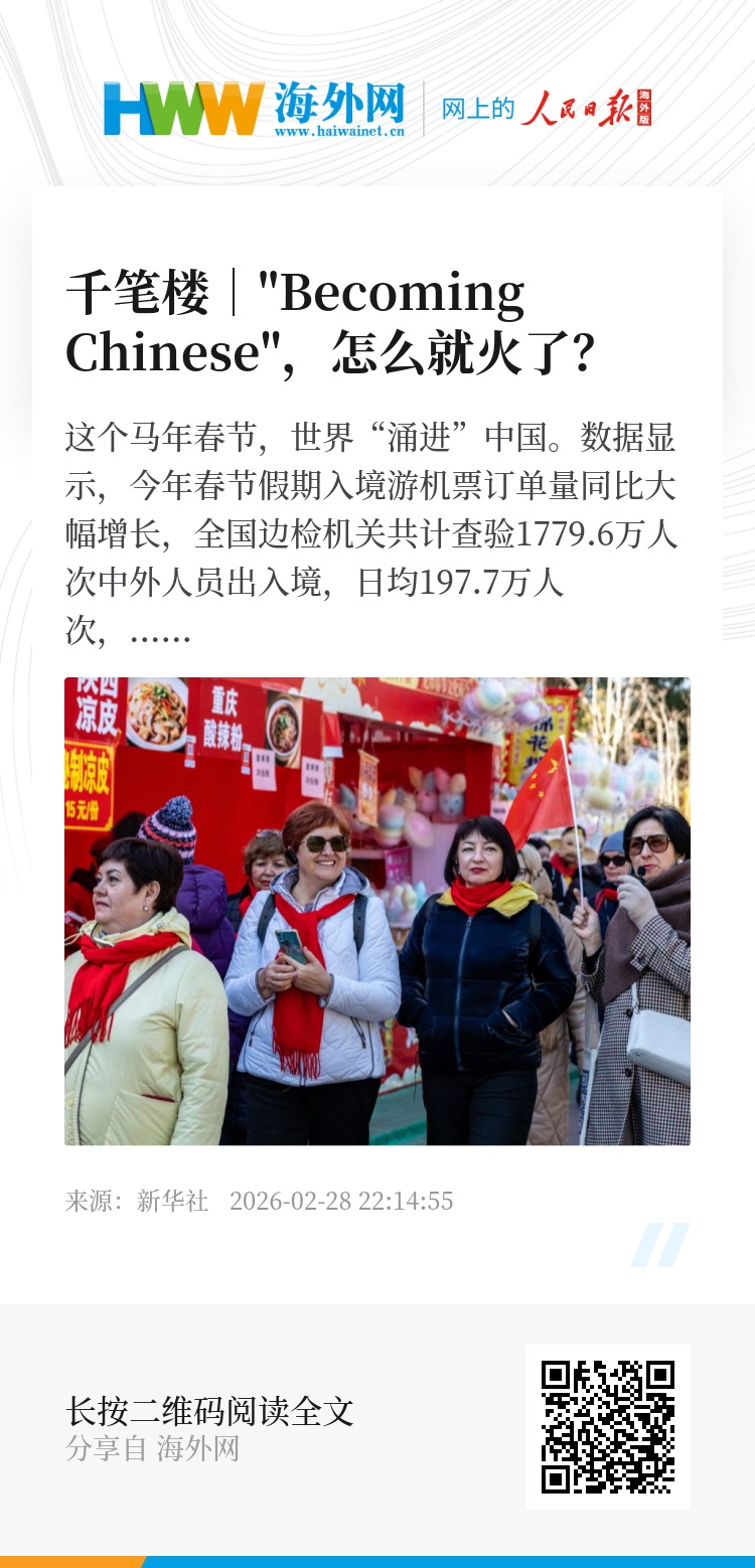 春节前夕,大量展示“中国式生活”的视频在海外社交媒体走红,“Becoming Chinese(成为中国人)”成为网络热词。外交部回应称,热忱欢迎外国朋友来中国过春节,体验热情友好,感受温暖喜庆。
