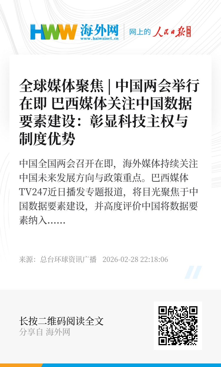 中国全国两会召开在即,海外媒体持续关注中国未来发展方向与政策重点。巴西媒体TV247近日播发专题报道,将目光聚焦于中国数据要素建设,并高度评价中国将数据要素纳入生产要素体系的做法,认为这体现出中国在数字时代构建科技主权与制度优势的探索。