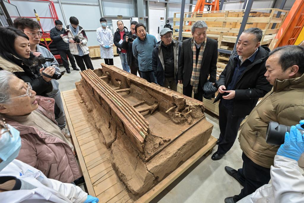 巴达木东晋唐时期墓群考古发掘负责人尚玉平(右二)向专家们介绍墓葬M20出土的彩绘木棺座。新华社记者 李贺 摄