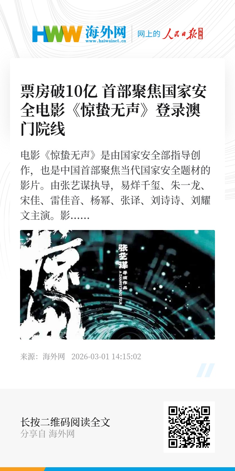 电影《惊蛰无声》是由国家安全部指导创作,也是中国首部聚焦当代国家安全题材的影片。由张艺谋执导,易烊千玺、朱一龙、宋佳、雷佳音、杨幂、张译、刘诗诗、刘耀文主演。影片凭借精彩紧凑的剧情、冷峻写实的画面风格与演员们的出色演绎,上映后引发热烈反响,目前内地票房已突破10亿。2月28日,该片登陆澳门各大院线。
