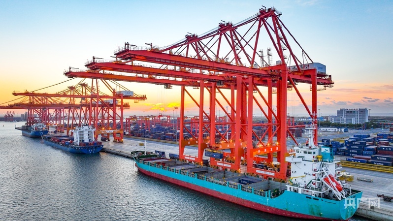 多艘货轮停靠在唐山港自动化集装箱码头进行装卸作业(央广网记者 李瑶 摄)