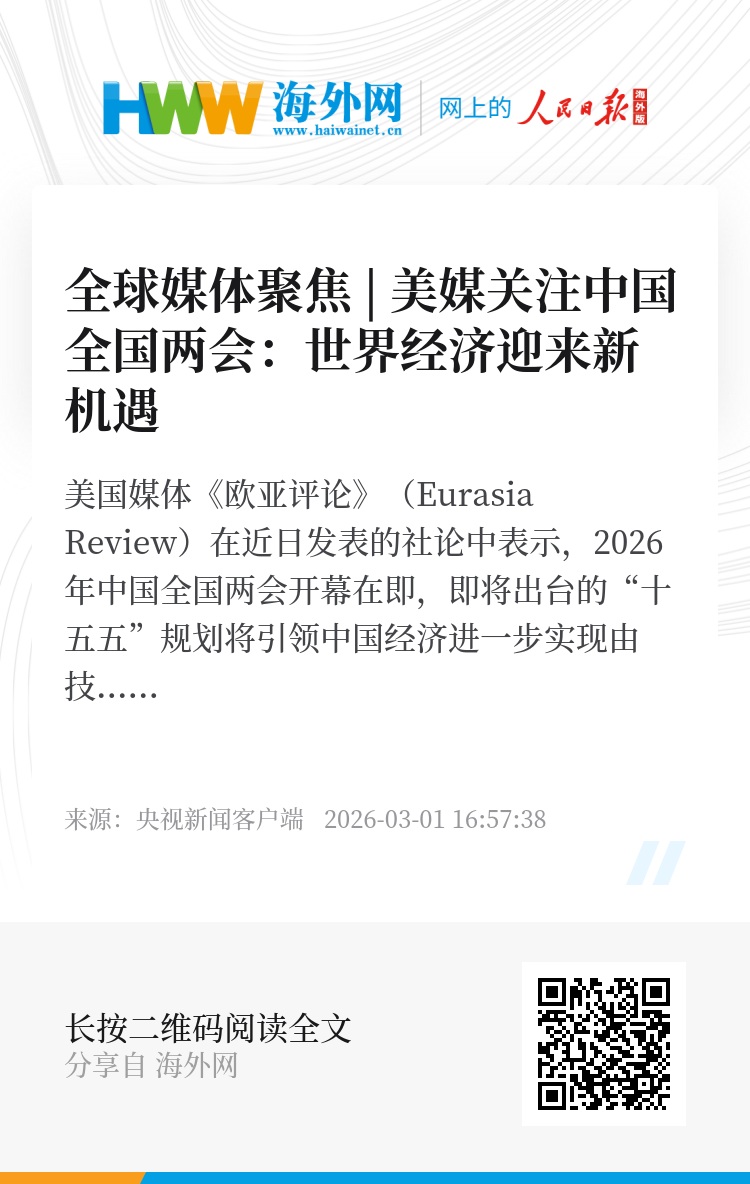 美国媒体《欧亚评论》(Eurasia Review)在近日发表的社论中表示,2026年中国全国两会开幕在即,即将出台的“十五五”规划将引领中国经济进一步实现由技术驱动和消费主导的高质量发展,世界经济也将由此迎来新的机遇。