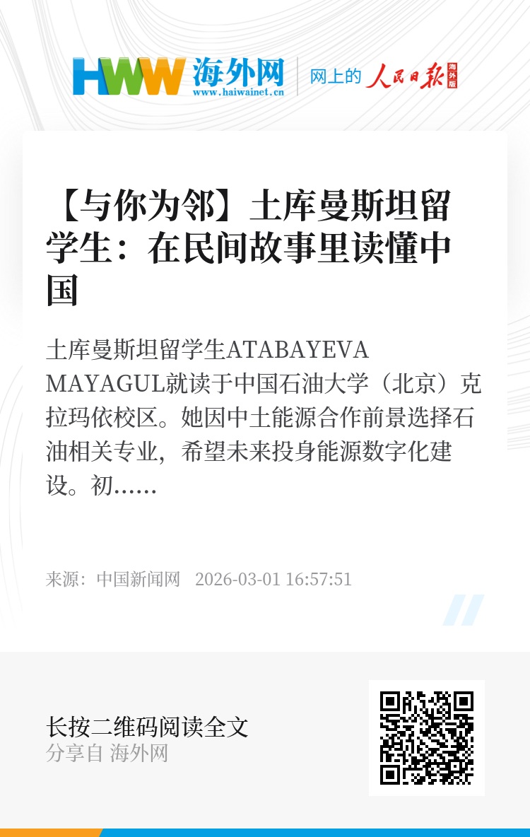 土库曼斯坦留学生ATABAYEVA MAYAGUL就读于中国石油大学(北京)克拉玛依校区。她因中土能源合作前景选择石油相关专业,希望未来投身能源数字化建设。初到新疆,她便被当地与家乡相似的气候、饮食和热情民风所打动。课余时间,她阅读《中国民间故事》,理解“团圆”“牵挂”等文化内涵,并通过绘画记录校园美景。她愿做两国友好的桥梁,为共同发展贡献力量。(赵凯)
