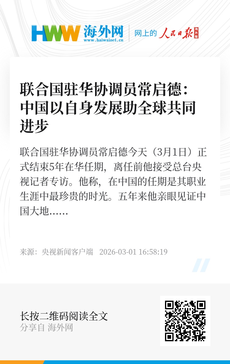联合国驻华协调员常启德今天(3月1日)正式结束5年在华任期,离任前他接受总台央视记者专访。他称,在中国的任期是其职业生涯中最珍贵的时光。五年来他亲眼见证中国大地上的自豪与荣光。迈入“十五五”,他相信中国的发展将为世界提供更多机遇。