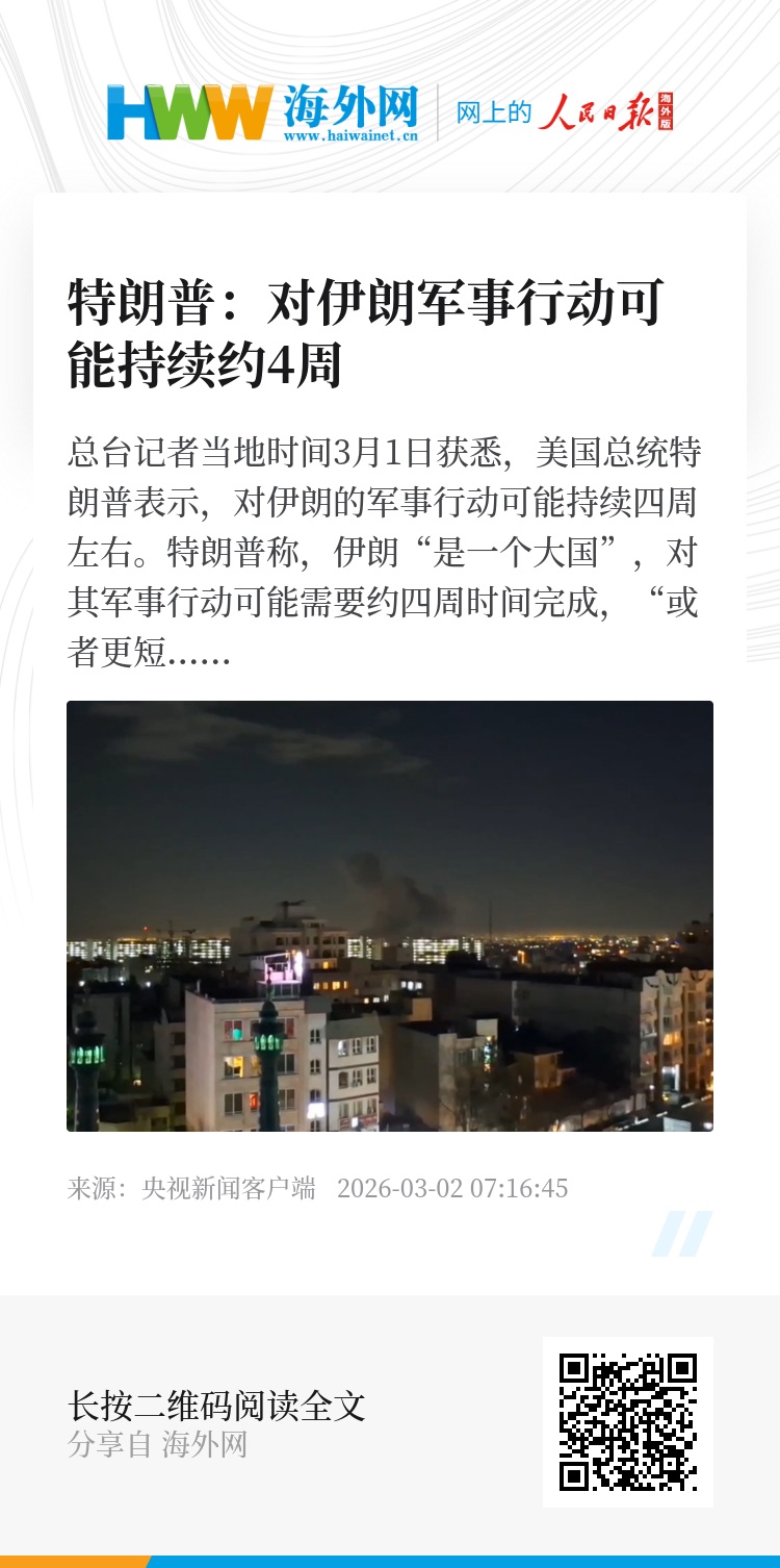 总台记者当地时间3月1日获悉,美国总统特朗普表示,对伊朗的军事行动可能持续四周左右。