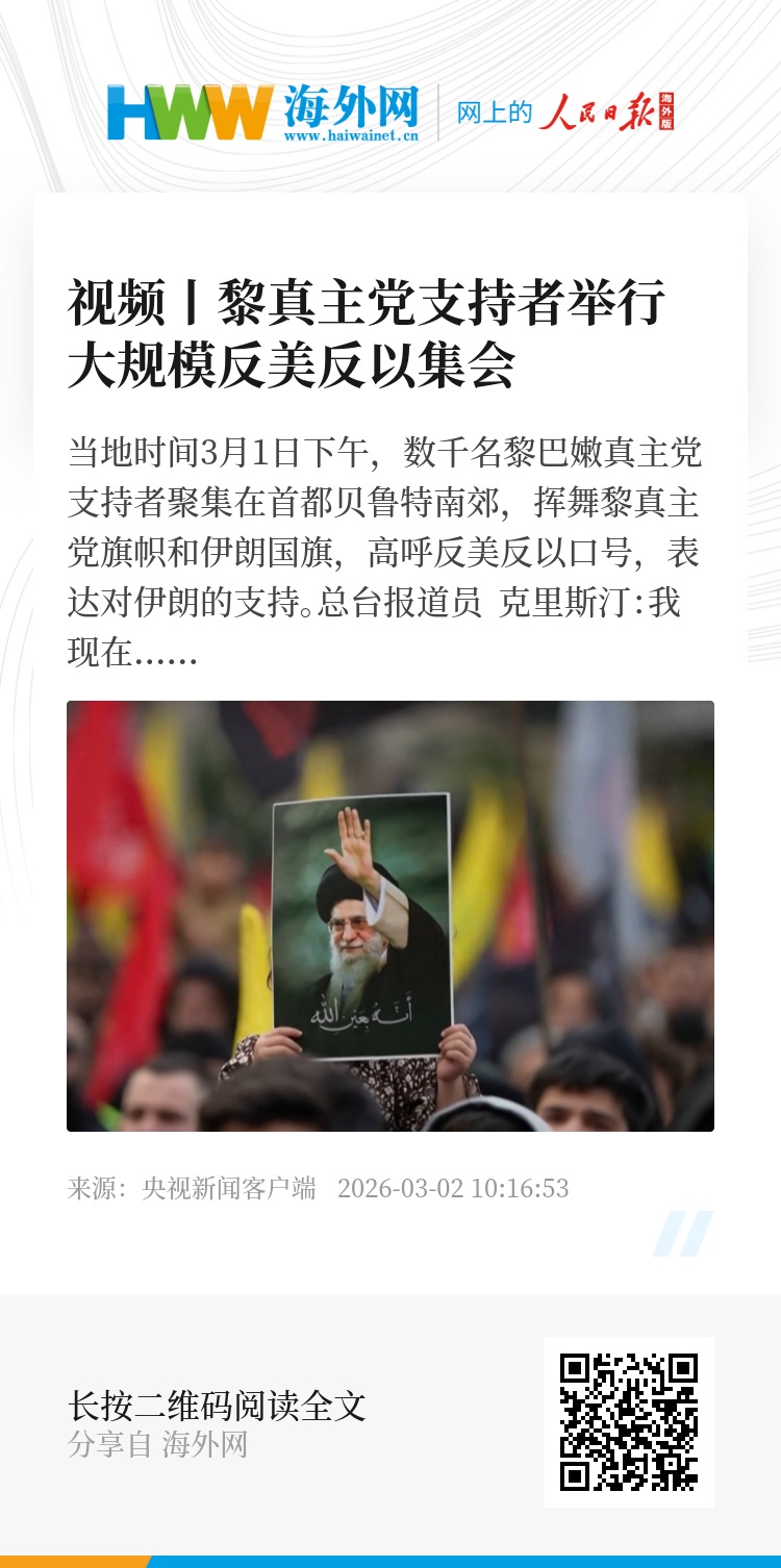 总台报道员 克里斯汀:我现在身处贝鲁特南郊,3月1日早些时候,黎真主党在此举行了一场大规模集会,旨在表达对伊朗的支持,悼念在近期美以空袭中丧生的伊朗人士,并重申对伊朗最高领袖哈梅内伊的拥戴。鉴于地区局势依然紧张,此次集会备受关注,被视为伊朗及其盟友可能发出的信号,目前该地区已加强安全措施。