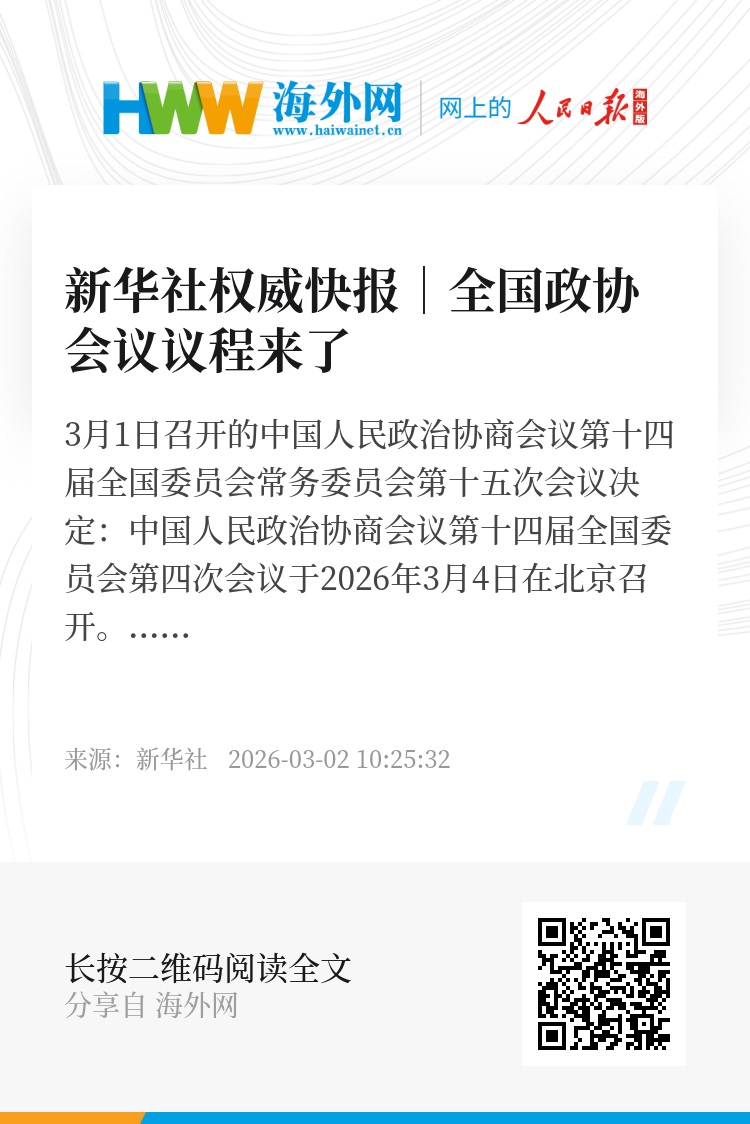 3月1日召开的中国人民政治协商会议第十四届全国委员会常务委员会第十五次会议决定:中国人民政治协商会议第十四届全国委员会第四次会议于2026年3月4日在北京召开。建议会议的主要议程是:听取和审议中国人民政治协商会议全国委员会常务委员会工作报告和全国政协十四届三次会议以来提案工作情况的报告;列席中华人民共和国第十四届全国人民代表大会第四次会议,听取并讨论政府工作报告及其他有关报告,讨论国民经济和社会发展第十五个五年规划纲要草案。