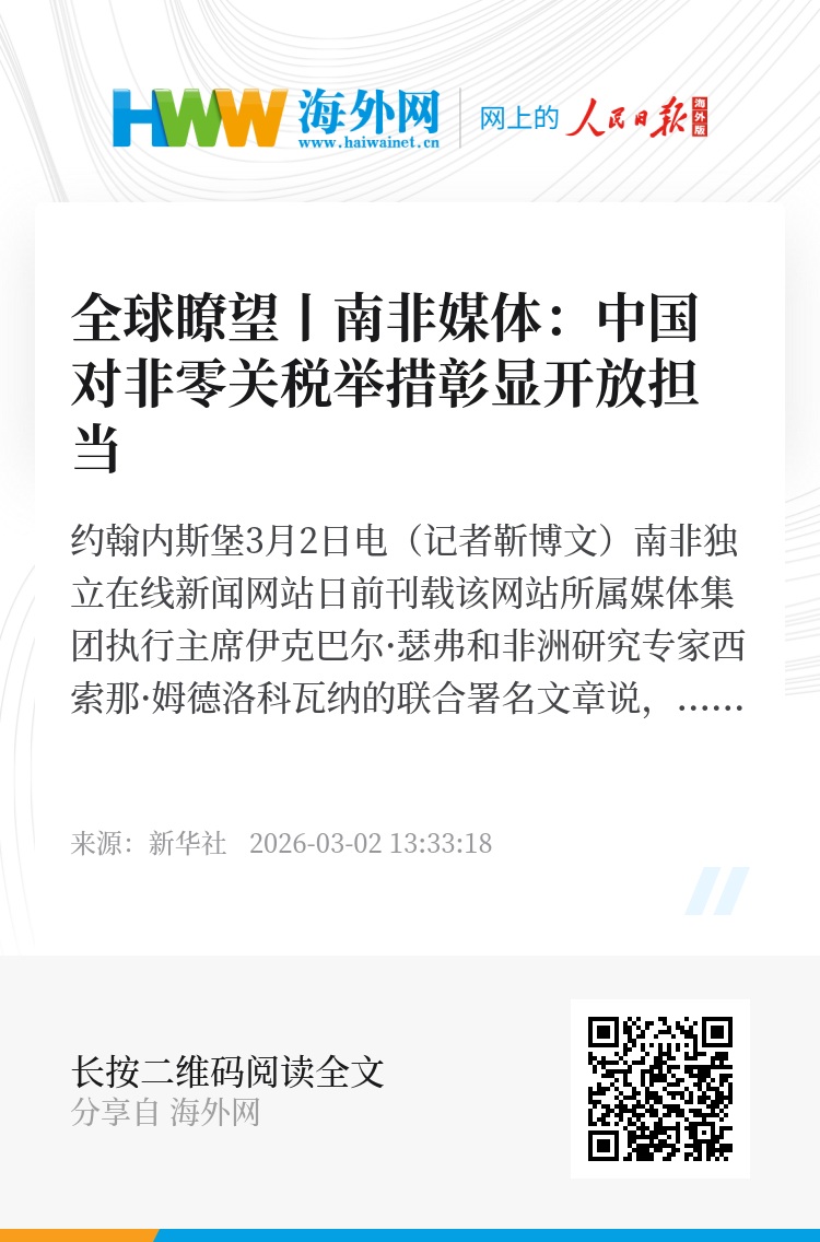 新华社约翰内斯堡3月2日电(记者靳博文)南非独立在线新闻网站日前刊载该网站所属媒体集团执行主席伊克巴尔·瑟弗和非洲研究专家西索那·姆德洛科瓦纳的联合署名文章说,中国宣布对53个非洲建交国全面实施零关税举措,向非洲国家进一步开放广阔市场,彰显中国在全球贸易体系中负责任的积极角色。文章摘要如下: