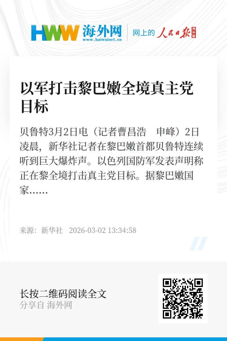 新华社贝鲁特3月2日电(记者曹昌浩 申峰)2日凌晨,新华社记者在黎巴嫩首都贝鲁特连续听到巨大爆炸声。以色列国防军发表声明称正在黎全境打击真主党目标。