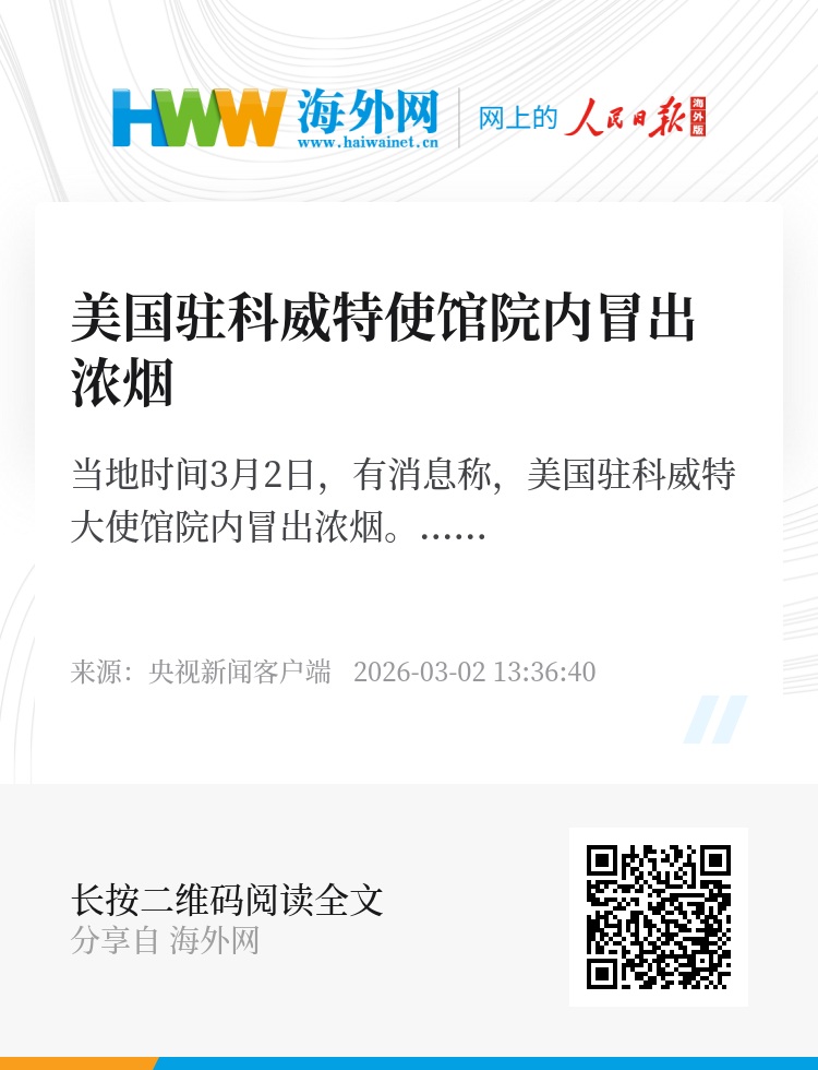 当地时间3月2日,有消息称,美国驻科威特大使馆院内冒出浓烟。