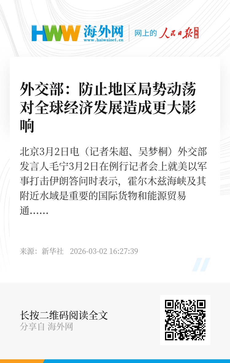新华社北京3月2日电(记者朱超、吴梦桐)外交部发言人毛宁3月2日在例行记者会上就美以军事打击伊朗答问时表示,霍尔木兹海峡及其附近水域是重要的国际货物和能源贸易通道,维护这一地区安全稳定符合国际社会共同利益。中方敦促各方立即停止军事行动,避免紧张事态进一步升级,防止地区局势动荡对全球经济发展造成更大的影响。