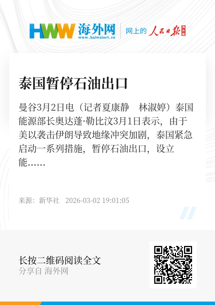 新华社曼谷3月2日电(记者夏康静 林淑婷)泰国能源部长奥达蓬·勒比汶3月1日表示,由于美以袭击伊朗导致地缘冲突加剧,泰国紧急启动一系列措施,暂停石油出口,设立能源紧急情况监测中心,以密切关注中东局势发展并评估其可能带来的影响。
