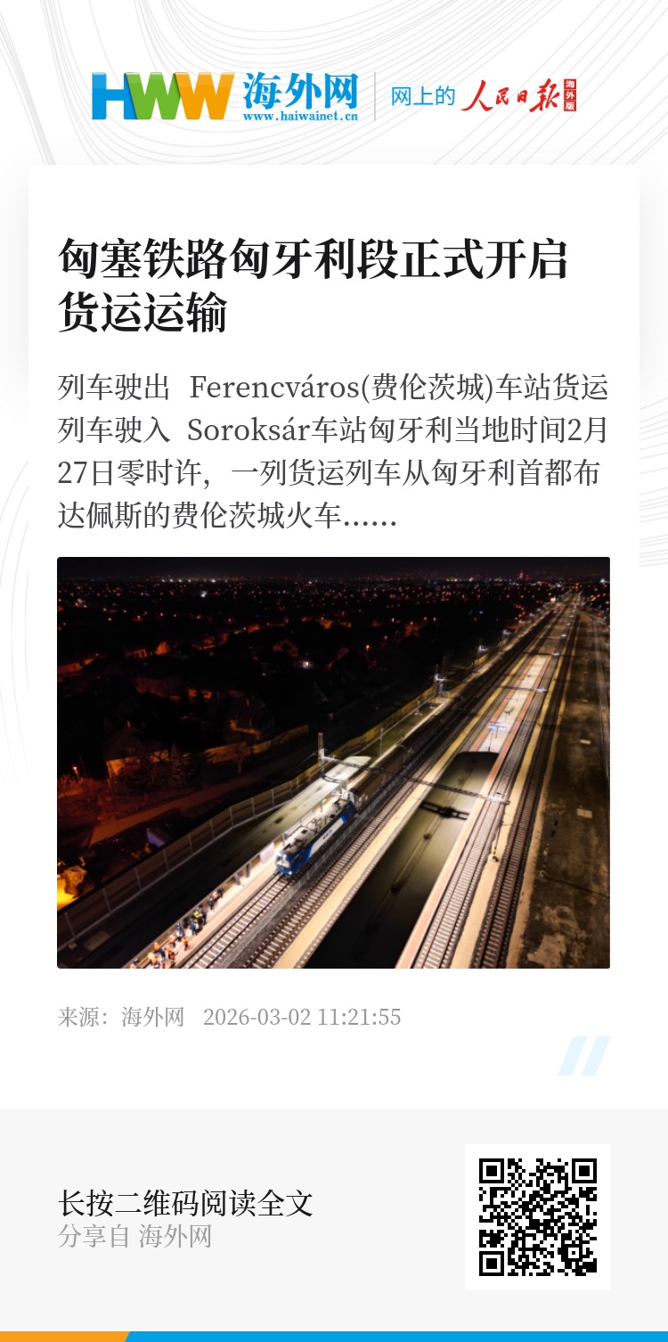 匈牙利当地时间2月27日零时许,一列货运列车从匈牙利首都布达佩斯的费伦茨城火车站驶出,标志着匈塞铁路匈牙利段正式开启货运运输。