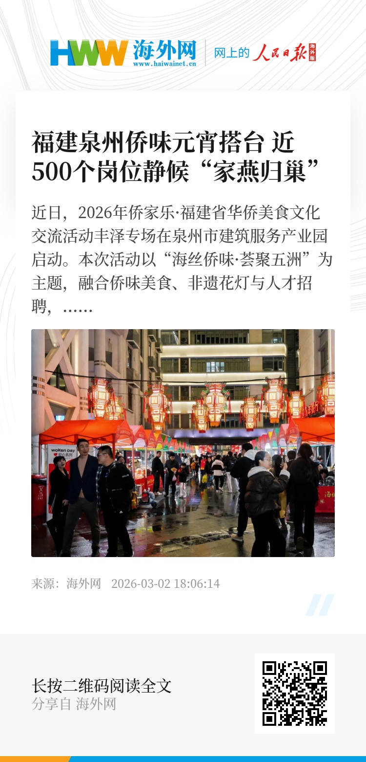 近日,2026年侨家乐·福建省华侨美食文化交流活动丰泽专场在泉州市建筑服务产业园启动。本次活动以“海丝侨味·荟聚五洲”为主题,融合侨味美食、非遗花灯与人才招聘,为市民游客带来一场可品、可感、可参与的元宵盛会。