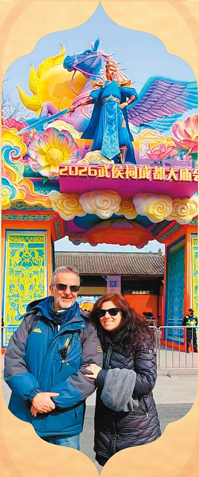 意大利游客马里齐奥和劳拉在四川成都武侯祠庙会。成都极自游国际旅行社供图