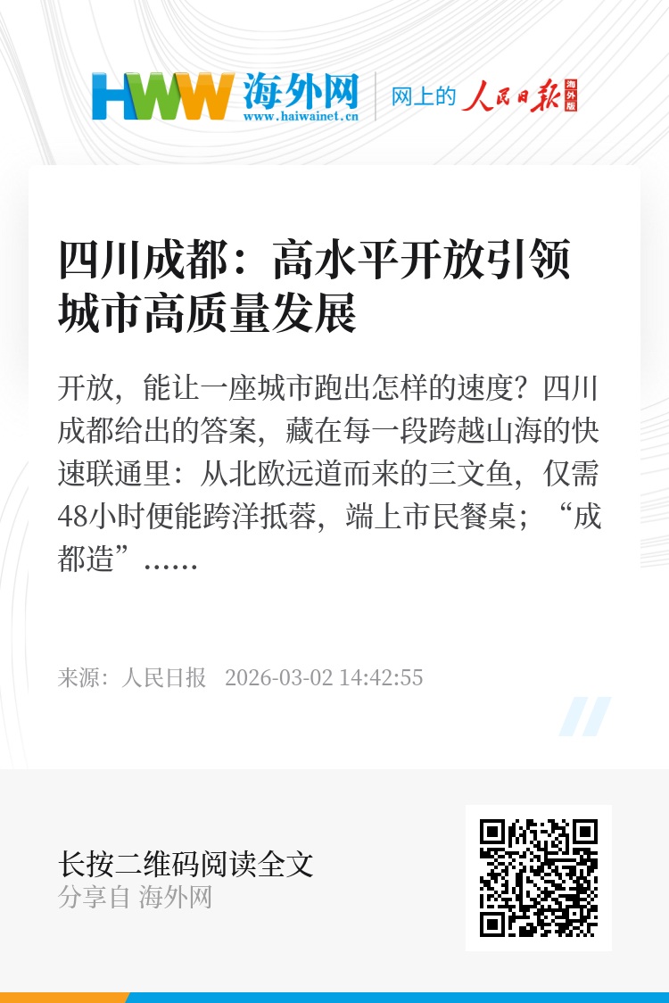 四川成都给出的答案,藏在每一段跨越山海的快速联通里:从北欧远道而来的三文鱼,仅需48小时便能跨洋抵蓉,端上市民餐桌;“成都造”电子芯片、汽车零部件从蓉城出发,72小时内即可精准送达海外工厂车间。