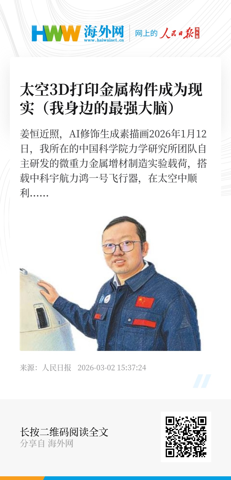 2026年1月12日,我所在的中国科学院力学研究所团队自主研发的微重力金属增材制造实验载荷,搭载中科宇航力鸿一号飞行器,在太空中顺利完成金属增材制造(即3D打印)实验并回收。这标志着我国太空金属制造技术正式迈入“太空工程验证”新阶段。