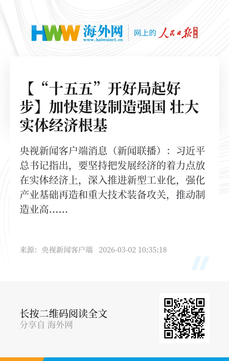 央视新闻客户端消息(新闻联播):习近平总书记指出,要坚持把发展经济的着力点放在实体经济上,深入推进新型工业化,强化产业基础再造和重大技术装备攻关,推动制造业高端化、智能化、绿色化发展。“十五五”开局之年,各地进一步锻造制造业“筋骨”,加快构建以先进制造业为骨干的现代化产业体系,持续巩固壮大实体经济根基。