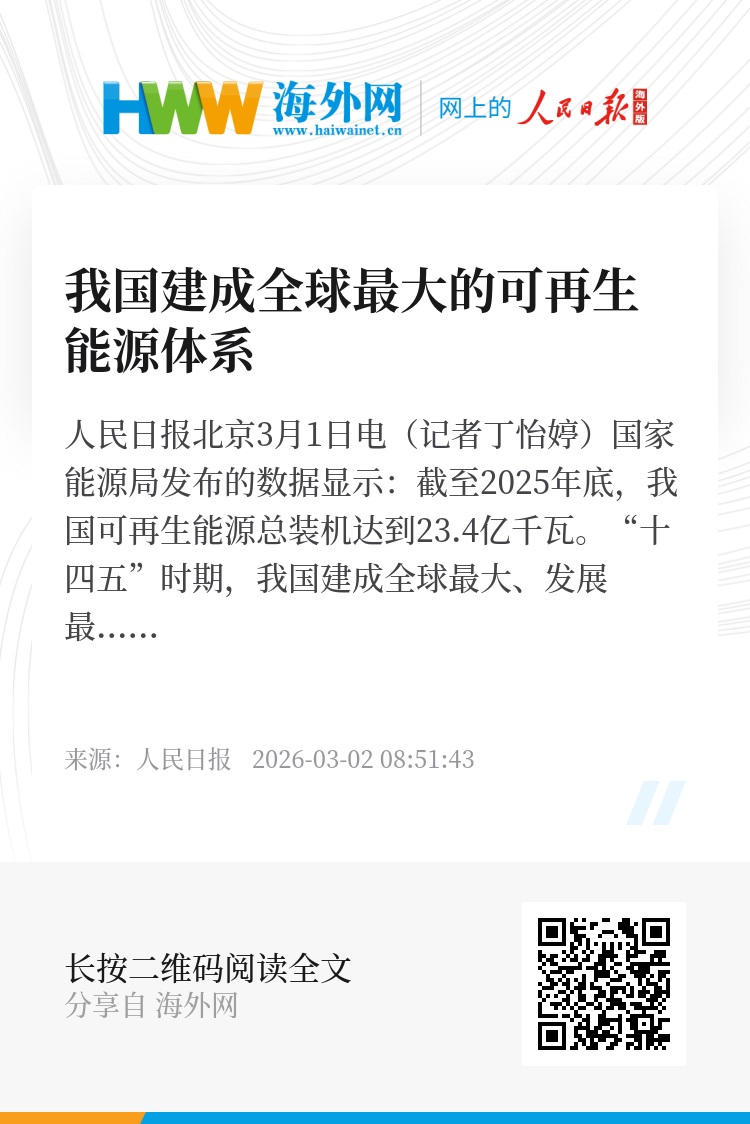 人民日报北京3月1日电(记者丁怡婷)国家能源局发布的数据显示:截至2025年底,我国可再生能源总装机达到23.4亿千瓦。“十四五”时期,我国建成全球最大、发展最快的可再生能源体系,可再生能源装机占比由40%提升至60%左右。