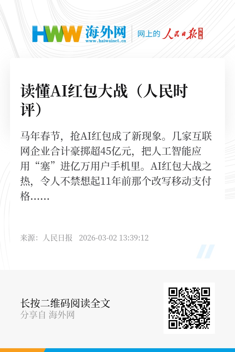 马年春节,抢AI红包成了新现象。几家互联网企业合计豪掷超45亿元,把人工智能应用“塞”进亿万用户手机里。AI红包大战之热,令人不禁想起11年前那个改写移动支付格局的除夕之夜。