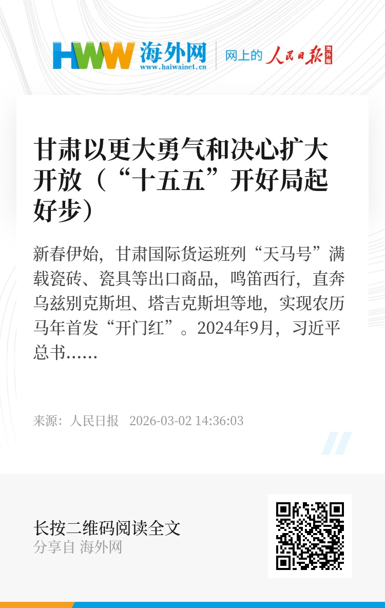 “牢记习近平总书记殷殷嘱托,甘肃深化同共建‘一带一路’国家和地区的交流合作,切实加大全方位开放力度,不断提高全省外向型经济发展水平。”甘肃省委书记胡昌升表示。(记者 董洪亮 王锦涛 曾亦辰)