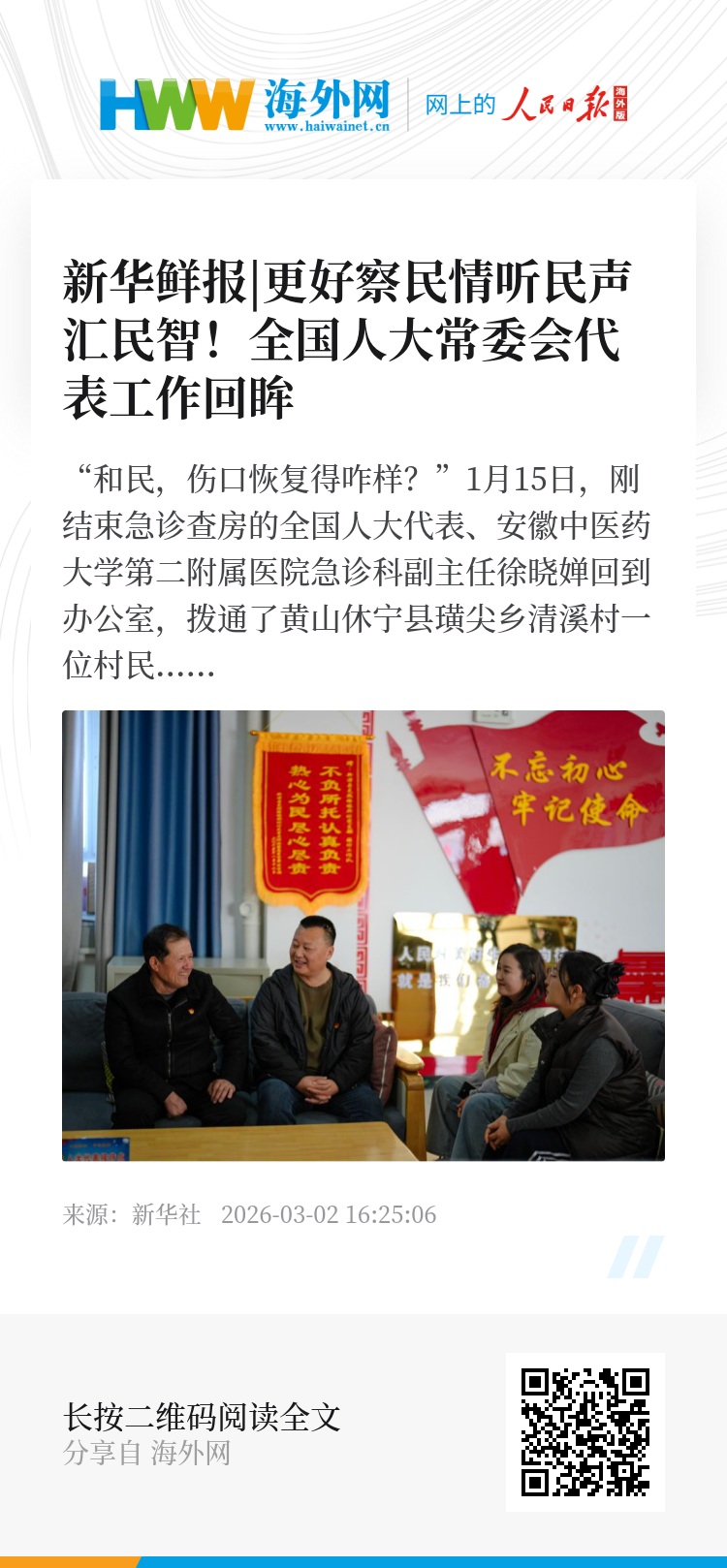“和民,伤口恢复得咋样?”1月15日,刚结束急诊查房的全国人大代表、安徽中医药大学第二附属医院急诊科副主任徐晓婵回到办公室,拨通了黄山休宁县璜尖乡清溪村一位村民的电话。