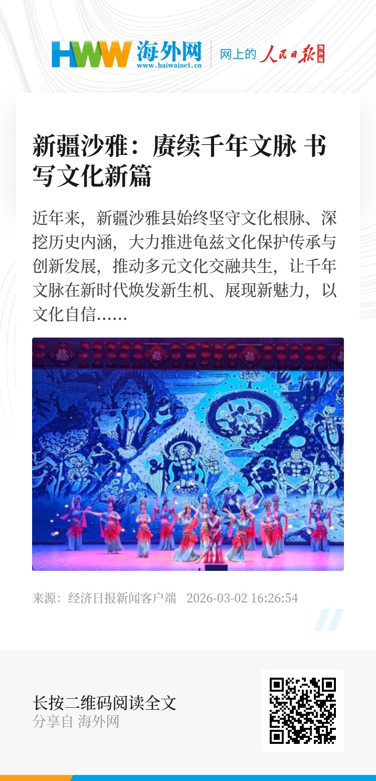 2026年央视春晚舞台上,节目《丝路古韵》以灵动典雅的龟兹乐舞惊艳全国。作为龟兹文化重要传承地、古丝绸之路文明交融的关键节点,沙雅县立足深厚历史底蕴与独特文化禀赋,以龟兹文化为魂、塔里木河文化为脉、胡杨文化为韵、非遗文化为根,走出一条文脉保护、活态传承、多元共生的文化发展之路,让千年文脉在塔里木河畔绵延不息、焕发光彩。