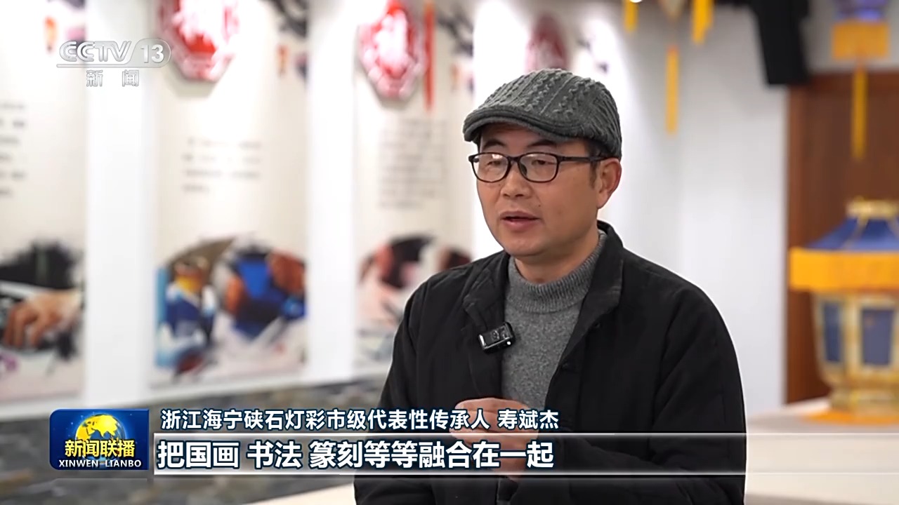 浙江海宁硖石灯彩市级代表性传承人 寿斌杰:主要是通过针刺把国画、书法、篆刻等融合在一起。在夜晚的灯光的透射下,会达到一种非常奇幻的,而且是万眼罗灯的效果。